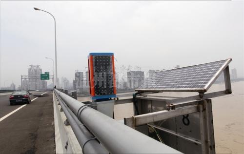 在过江通道主桥段,你会看到有一个个长方体,戴着蓝色的“帽子”,镶了橙色边的黑色“外套”。这是一种雾灯,全称叫做“太阳能AGS智能雾区引导系统”,桥上一共装了120个,主要的作用是这个灯能自动检测到雾的浓度,雾天时亮起黄灯。这种穿透力强的灯光,便于司机在雾天看到过江通道的边缘。