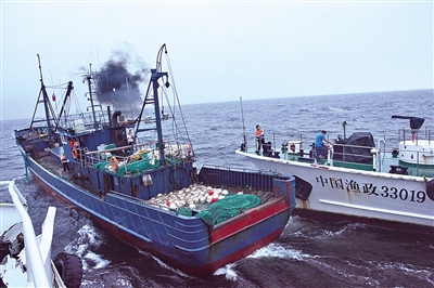 渔政船好不容易才控制住偷渔的渔船。 章国森 摄