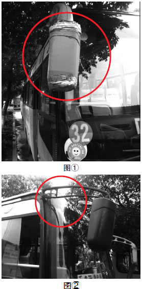 此外,还有一些车辆的后视镜已严重变形,只剩一个“骨架”摇摇欲坠的样子(图②)。司机表示曾将上述情况向该公司维修部门多次反映无果,一些车辆连用胶带纸固定的“待遇”都没有,只好“睁一只眼闭一只眼”,熬一天是一天。