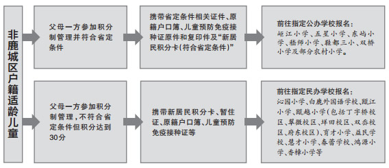 非鹿城区户籍适龄儿童父母一方参加鹿城区积分制管理并符合省定条件的,凭省定条件相关证件及原籍户口簿、儿童预防免疫接种证原件和复印件及积分管理部门提供的“新居民积分卡(符合省定条件)”前往指定公办学校报名,报名时间为7月3日(周四)、4日(周五),7月9日(周三)为补报时间。