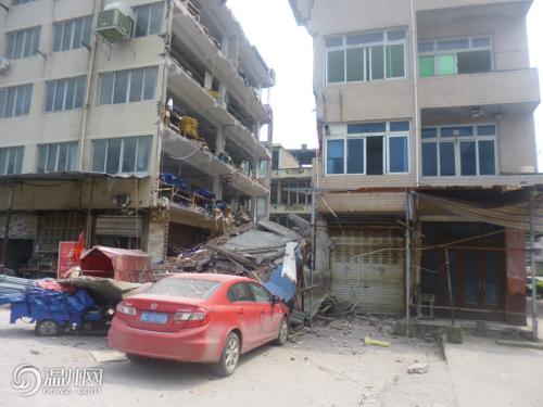 龙湾区永中街道郑宅村白水路20弄1号,这是两间四层半民房,受暴雨影响昨天已经整体坍塌。在坍塌民房边的马路上,有一辆红色轿车及三轮车被混凝土、砖块等砸到。