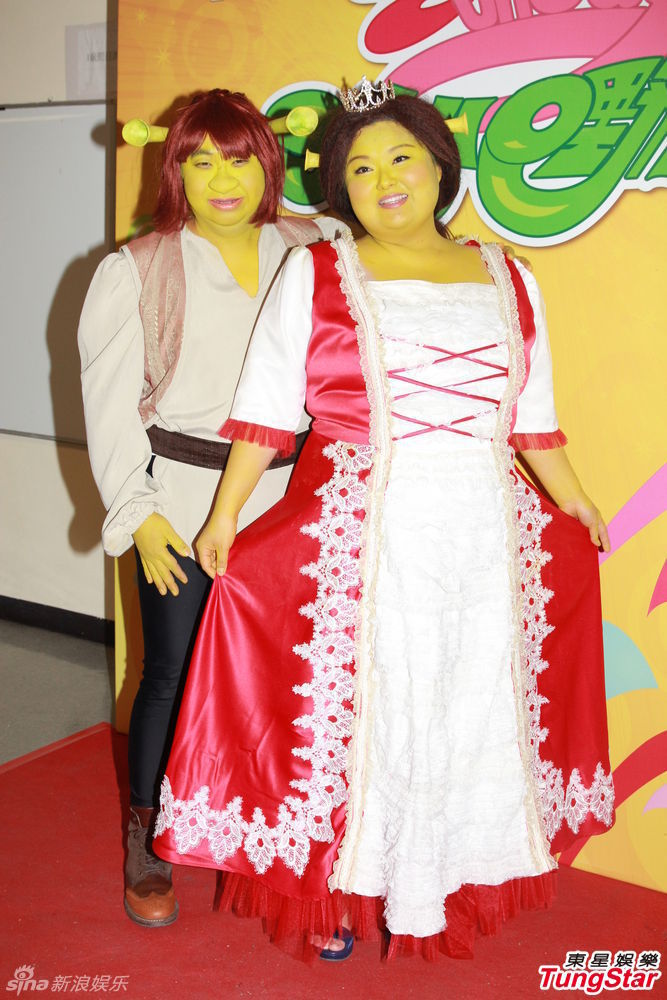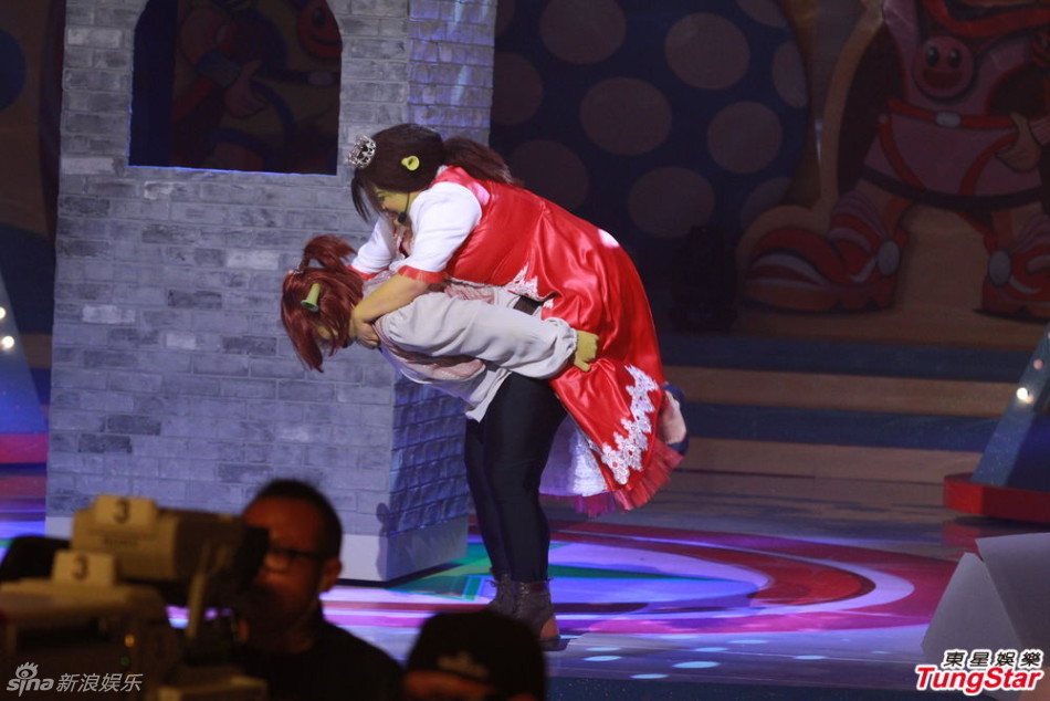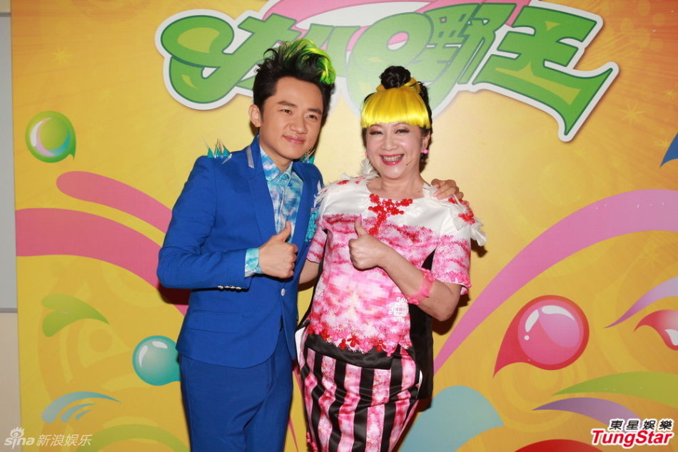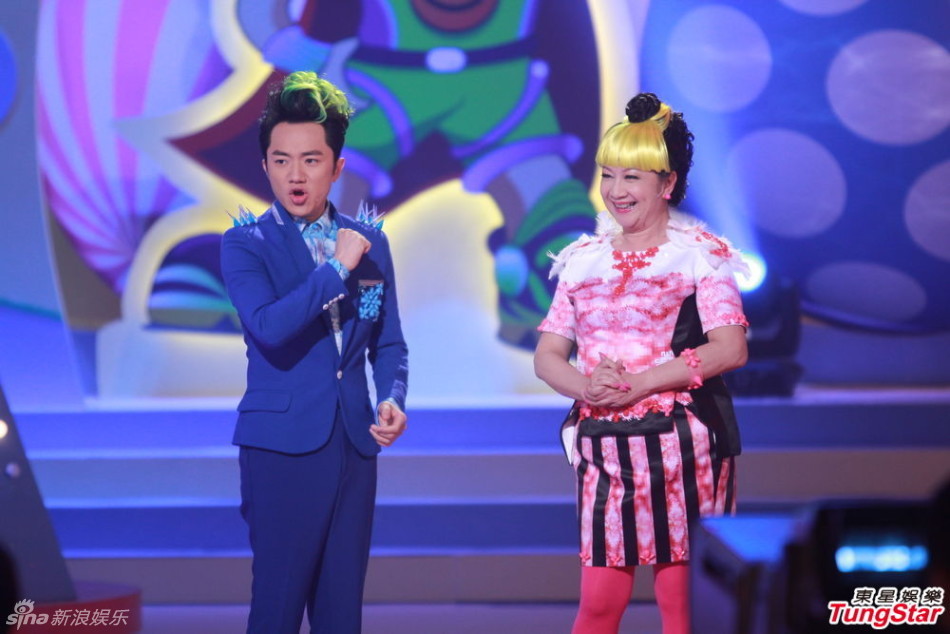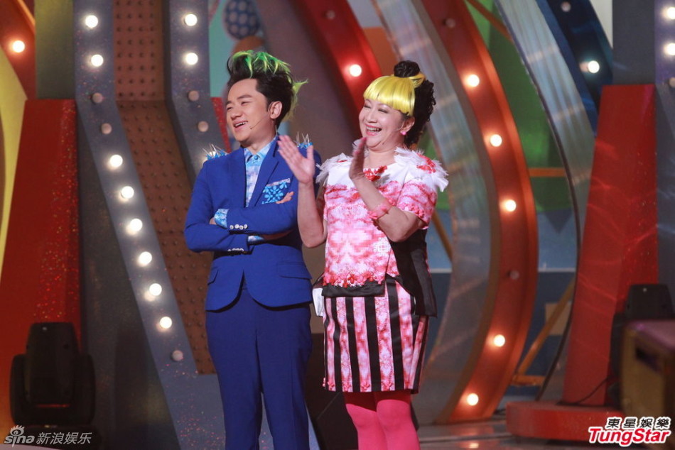 新浪娱乐讯王祖蓝、薛家燕、虾头、小宝、张致恒、何傲儿等在TVB一厂为节目《Sunday扮嘢王》录影。众星的夸张打扮搞怪,王祖蓝头顶一撮绿毛似绿帽。