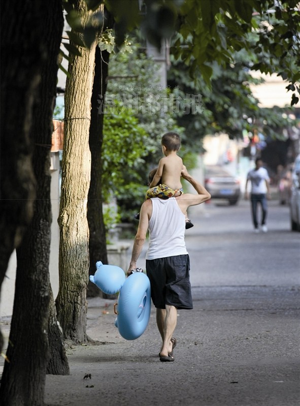 昨天,在市区鹿城路旁,一男士带着孩子,拿着游泳圈走在路上。