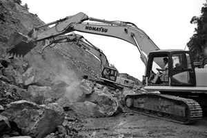 在位于龙湾区曹龙大道末段的快活岭段施工现场,记者看到两台镐土机和一台挖掘机正在马不停蹄地工作着,而摆在它们面前的,是两座体形巨大的高山。
