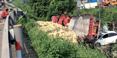 高速交警接警后赶到现场,当时高速公路的护栏被撞倒一片,一辆苏G牌照的红色半挂车躺在护栏外的路基上,半挂车上的货物撒了一地,且半挂车的车尾还压着一辆浙J牌照的白色福克斯轿车,引擎盖已经被压扁了。