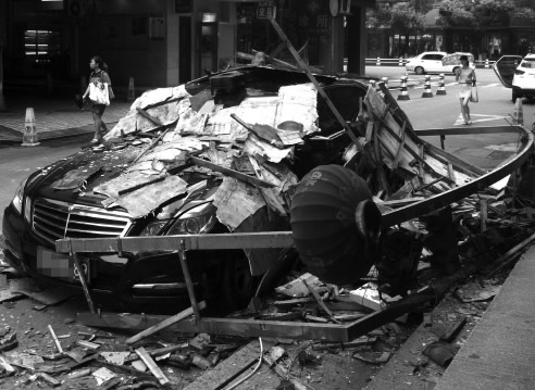 10平方米广告牌突然掉下 砸中停在下面的奔驰车