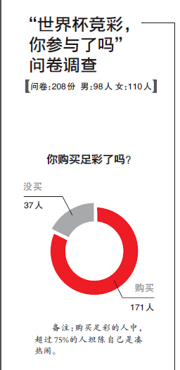 为此记者发起“世界杯竞彩,你参与了吗”问卷调查,最终收到208份有效问卷。结果显示,超过82%的人今年世界杯通过各种方式购买了足彩。