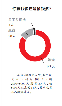 “当然了,最终还是输多赢少。”谈起结果,市民周小姐还是很心疼,本来想赢点零花钱,但事与愿违。问卷调查亦显示,不算今晨的冠军之战,目前输钱的有147人,而赢钱的仅20位,其余4人是输赢差不多相抵。