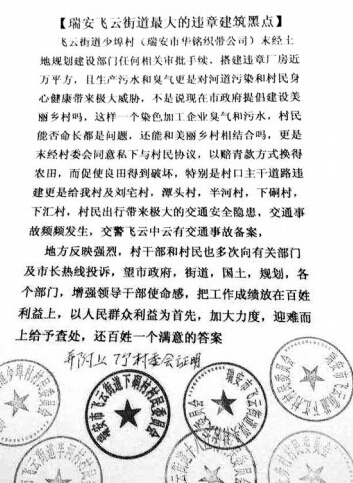 温州网讯 最近,有人在一论坛发帖,内容为温州瑞安飞云街道有7个村委会联名举报一家印染企业,该帖称涉事企业未经土地规划部门审批,搭建违章厂房,且生产污水对河道造成污染,散发出来的臭气给当地村民身心健康带来极大威胁,特别是村口主干道路违建更是给少埠村、下埠村及刘宅村、潭头村、半河村、下硐村、下汇村、十八江村等村的村民出行带来不便。