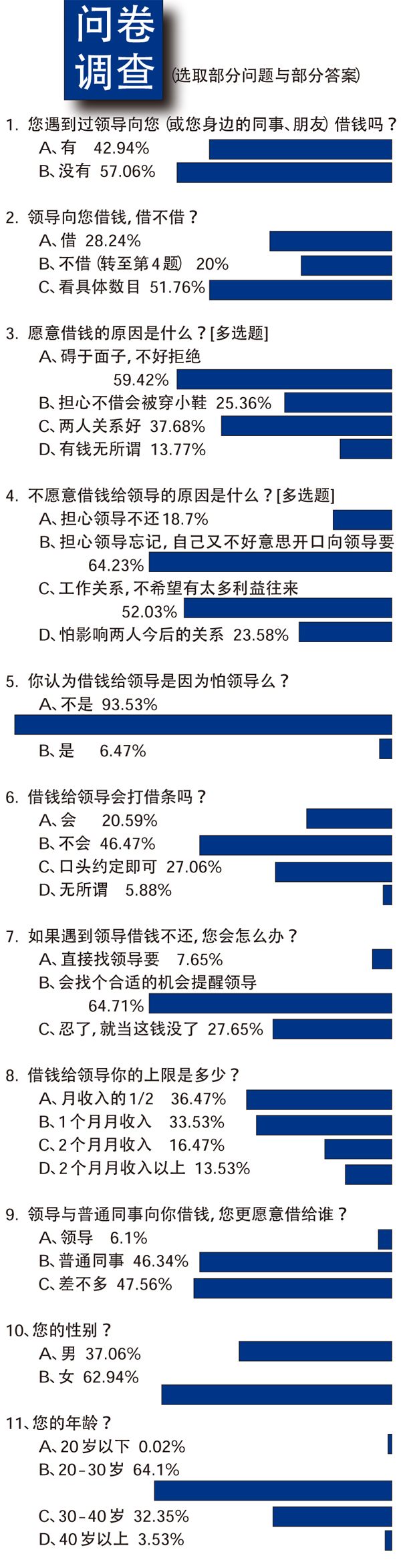 领导向您借钱,您借还是不借呢?本次调查采用纸质问卷和网络问卷,共发布172份问卷,收回有效问卷170份。纸质问卷由本报记者分别前往政府部门、企业、住宅区、车站、街头等地随机发放。受访者中有刚入职的菜鸟,也有在职场滚打二十多年的职场霸主;有在讲台上教书育人的教师,也有在急救室里救死扶伤的医生;有月入上万的金融业从业人士,也有生活小康的普通白领……约96.45%的受访者年龄为20-40岁,正值盛年。42.94%的受访者表示有被领导借钱的经历。