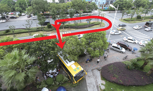 温州一辆公交车调头失控冲上人行道 连撞两车