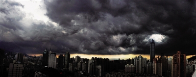 昨天15时15分许,市区上空乌云翻滚涌向南端,天地间只留一道金光。随即,天空雷电交加,暴雨瞬间袭来。苏巧将 摄