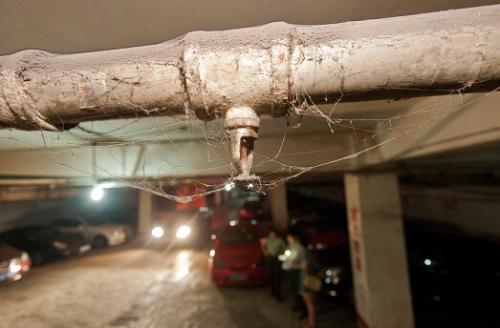 与每个感烟探测器相近的,有一排铁质的钢管,管道上结满厚厚的蜘蛛网,大部分已经发黑。检查人员说,蜘蛛网下的管道是水管,用水银柱的喷头堵住,它可以承受的温度是68℃。当在发生火情的温度超过这个温度时,将会自动喷水灭火。“现在自动灭火系统已经失灵”。