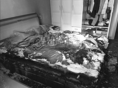 消防队员把火扑灭后,发现吴女士死在床上,身上有水疱,且头部都是血,有被钝器击打的痕迹。