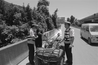 昨天中午11时许,市交警三大队大队长柯受勤、教导员洪亮巡逻至瓯海大道建中街入口上匝道口时发现,一辆平时只能在海边沙滩上开的沙滩摩托车,居然开上瓯海大道高架,往市区方向疾驰,随即,民警将其截停。