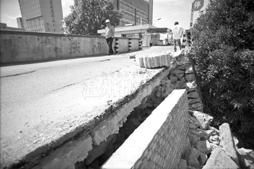 图为路基坍塌后的“架空路”,路面出现裂缝,路边十余米长的护栏倒塌。钱鹏鹤/摄