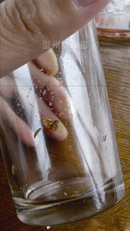 吴女士说,当时她见那杯西瓜汁颜色有些浑浊,但无变质味道,就倒在杯中饮用。快喝完时,她才发现杯底有十多条活虫(如图),而朋友的杯底也有三五条。这些虫子约有5毫米长,这让她们恶心不已,也不能确定饮用过程中是不是喝下了活虫。该店负责人查看后,立即派人陪同她们去医院检查。