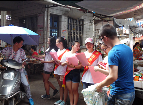 早上8:30,活动准时开始。实践队队员身佩反邪标语,走近街道、集市,向广大市民分发反对邪教倡议书,向过往行人和街道上的商家宣传反邪教科学知识。在活动过程中,还有市民上前与实践队队员交流,告知我们其生活中对邪教现象的困惑,希望了解反邪教的知识,现场气氛活跃。