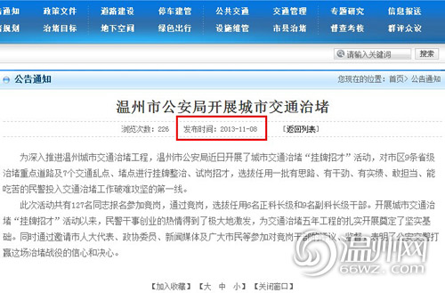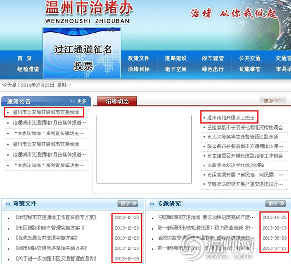 该网站首页上“通知公告”栏的头条为8个月以前的内容:2013年11月8日“温州市公安局开展城市交通治堵”。“治堵动态”栏目下的头条则为“温州市将开通水上巴士”,而众所周知,温州开通水上巴士是2013年7月的事情。