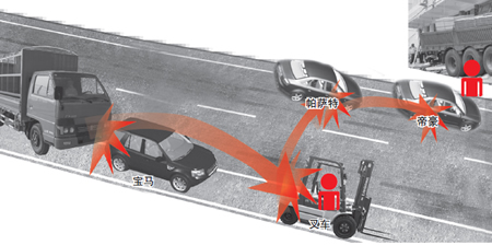 一目击者描述,这辆失控的半挂车撞到叉车时,叉车连司机一起飞了起来,最终落到了道路右侧的民房前。