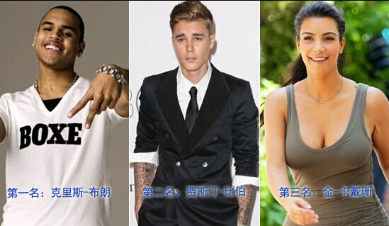 近日,加拿大偶像歌手贾斯汀-比伯(Justin Bieber)与“精灵王子”奥兰多-布鲁姆(Orlando Bloom)在西班牙大打出手,随即各大美国媒体纷纷献上了自己的吐槽,再一次体现了贾斯汀-比伯的名声到底有多糟糕。而在8月3日,有媒体爆出曝“暮光女”克里斯汀-斯图尔特(Kristen Stewart)抢了詹妮弗-劳伦斯(Jennifer Lawrence)男友尼古拉斯-霍尔特(Nicholas Hoult),二人同游日本吃寿司,于是又引起网民的一片吐槽,大呼暮光女无节操。那么在美国人的心目中,谁是声名狼藉最应该“滚出娱乐圈”的明星呢?以下就是结合美国杂志观众调研与使用关键词“hate+明星姓名”在社交网站搜索量得出的排名结果!