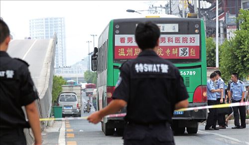 昨天上午10时30分,在瓯海大道吕家降路口处,事故公交车停靠在路边,乘客均已疏散完毕。四周拉起警戒线,警方正在疏散群众、维持交通秩序。