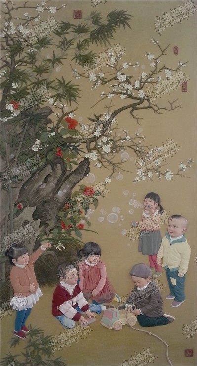 周锦云说,传统技法讲究精细,近年来特别招募了一批艺术类本科生。中国美术学院壁画系的雷建栲是众多大学生学徒中优秀一员,来这里不到五年,已成为了工作室的中坚力量。他以人物创作为主,作品《暖冬婴戏图》巧妙地模仿了宋代著名的《冬日婴戏图》,选取图中景色,替换了景中戏耍的孩童,似有古今穿越之感。六个儿童一起玩耍,有吹泡泡的,有摆弄小汽车的。孩童的发式、衣着、玩耍的把戏已然不同,但庭院里的梅花、山茶,经历时代的变迁,却风华依旧,两个时代的孩子们,虽然间隔千年,但童真不变。他还被市政府评选为“温州市十佳中青年技能岗位人才”。