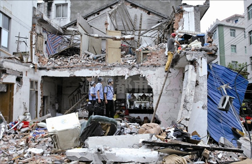 温州网讯 发生坍塌的民房位于磐石社区菜场南路,是两间二层砖木结构的房子,房龄10年左右。一楼开着两家商店,分别卖童装和高粱酒。爆炸过后,童装店成一片废墟,卖高粱酒的商店屋顶与部分墙壁坍塌。