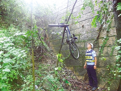 温州市区景山发生了惊险一幕。市民徐先生在骑自行车下山的过程中,因为超车而速度过快,直接坠下山坡,幸好有一棵坚挺的小树将自行车接住。
