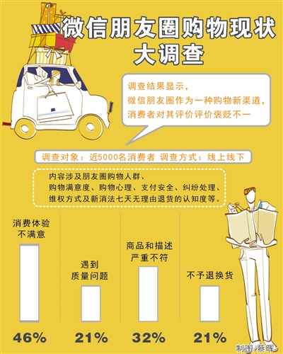 今年3月-5月,省、市两级消保委通过线上、线下两种方式,对近5000名消费者就微信朋友圈购物消费现状进行调查。内容涉及朋友圈购物人群、购物满意度、购物心理、支付安全、纠纷处理、维权方式及新消法七天无理由退货的认知度等。