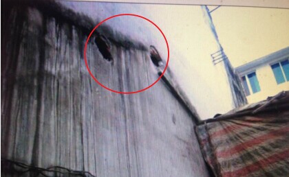 图中红圈处:主梁断裂掉落,屋外留出两个洞。侯婷婷 摄