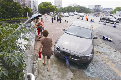 昨天上午8时30分许,市区锦绣路上车流量十分大,在文明桥路段,一辆从东向西行驶的宝马车突然发飙,它先是追尾了一辆出租车,却没有丝毫刹车的意思,车头顶着出租车,加速撞断多段防护栏杆,向路边冲去,最终卡在了人行道上。“我在正常行驶,发现后面的车子撞了上来,直接将我的车顶到了非机动车道上,速度很快,我刹车都刹不住。”的姐马丽军回忆当时惊魂的一幕时说。