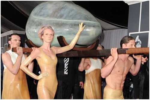 嘎嘎姐,又名“雷神”,总是不遗余力趾高气扬地用实际行动向全世界所有的艺术家们宣告,自己才是真正的行为艺术大师。还记得2011年的格莱美红毯,Lady Gaga化身异形,藏身在一个巨大的石头中,由壮男美女抬进场,全程不见Gaga真容,彻底颠覆了格莱美50多年来的红毯概念。而在更早些的2010年MTV音乐颁奖礼上,Gaga身穿生肉装亮相,彻底吓坏了观众,激怒了动物权益保护组织。Gaga姐用生命诠释着她心目中的行为艺术,这等勇敢,也感染了国内外的许多明星,就如尚雯婕这几年来众多雷人的造型,大概也是受到Gaga的鼓舞吧。