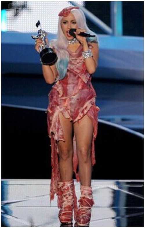 在更早些的2010年MTV音乐颁奖礼上,Gaga身穿生肉装亮相。