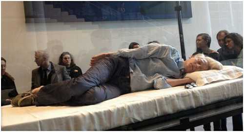 出身贵族的英国女星蒂尔达-斯文顿(Tilda Swinton),也是演艺界行为艺术的代表。2013年3月23日,仙姑出现在了纽约现代艺术博物馆(MoMA),展现行为艺术“The Maybe”。她躺在博物馆中的一个透明玻璃箱内睡觉,任人拍照参观,犹如一件“展品”,吸引到了许多路人围观。而在这一年内,她必须在博物馆的不同地点“睡足”6次以上,每次睡觉的时间地点仍未确定,也不会事先预告,玻璃箱也会随时移动地方。围观群众纷纷表示,仙姑是真的睡着了吗?从仙姑身上散发出的仙气会不会把玻璃箱撑爆啊?《博物馆奇妙夜》真的是应该请蒂尔达来演啊!一直拿不到奥斯卡影后的蒂尔达-斯文顿,该不会觉得这样睡一睡,就能打败表姐詹妮弗-劳伦斯吧?