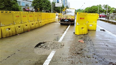 据现场工作人员介绍,早上7点多就发现中间车道上出现了新的塌陷口,马上通知有关部门围护,避免出现事故。早高峰期车流量大,当时很多车辆堵在桥头,后来经过疏散和绕道,到早上10点半左右,附近交通状况才恢复正常。