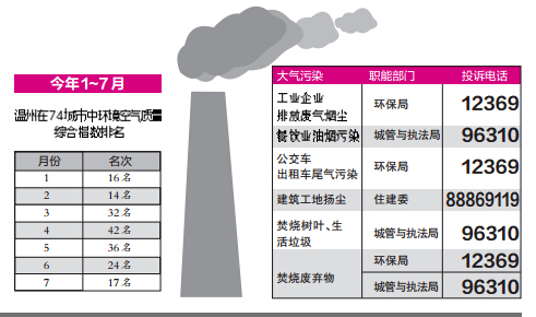 根据生态省建设目标考核任务,温州市区空气优良率要达到75%以上。2013年,市区空气质量优良率仅为68.8%;今年1月至7月,市区的环境空气质量优良率已达到考核的要求。
