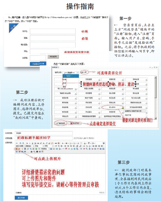 网民通过手机认证(凭手机验证码确认)注册后,即可向入驻平台的各单位进行问政。各问政单位按职能和事权范围直接对网民问政事项进行调查、办理、答复,并对答复结果负责。