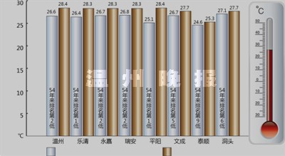 市气象台就针对最近的凉爽天气做了一次数据分析,他们将8月8日到8月20日这13天内,温州市级气象监测站及各县站(由于苍南历史资料缺失未纳入统计)在该时期内的平均气温,与历史同期(从1961年到2014年)的数据进行纵向比对,结果发现今年的数据创下了多项历史新纪录。