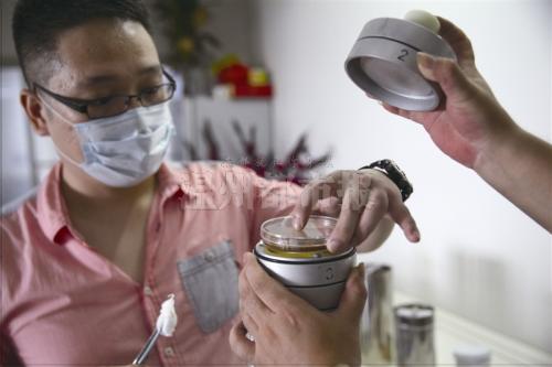 工作人员将营养琼脂平皿放入6级空气微生物采样器里,放好后将用来采集空气样本。