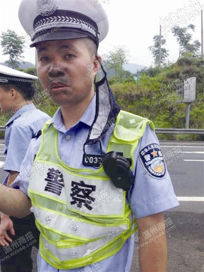 交警王辉来回隧道救人,脸被浓烟熏黑。