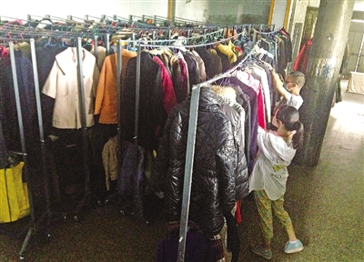 打开仓库卷门,打包代运的编织袋整齐地码在外间;志愿者们在小桌子上一件件分拣衣服,挂到衣架上。里间仓库,54排双层的金属落地衣架把百多平方米的库房挤得只剩一条过道。