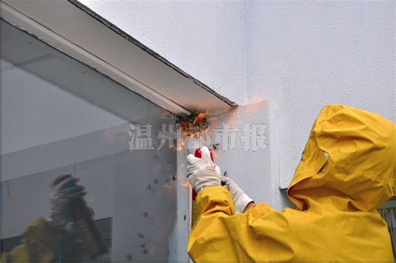消防队员赶到现场后,先穿戴好防蜂服,再利用打火机将杀虫剂点燃并对准马蜂窝喷射后,利用蛇皮袋将马蜂窝摘除。为防止马蜂在原址筑窝,他们继续用杀虫剂驱赶“漏网之鱼”。不到10分钟,4个马蜂窝连同里面的马蜂全部被清除。
