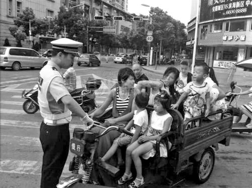 温州网讯 昨天上午8时许,一辆动力三轮车由瑞安城区沿江东路驶来,1平方米左右的三轮车车斗里坐满了孩子和大人。交警随即拦下,仔细一数,车上共有3个大人、4个孩子(如图)。据开车女士称,她们是新瑞安人,都是邻居。因为坐车不方便,就开上自家运货的三轮车送孩子去幼儿园。交警立即责令这一车人下车乘坐其他交通工具上学校,并对家长和孩子进行安全教育。交警称,孩子的第一任老师就是父母,开学第一课其实就在路上,要为孩子创造一个安全的上学环境。