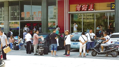 一身T恤装,头戴旅游帽,拖上行李箱,昨天上午9点45分,市区汽车南站门口出现两名乘客,立即有手拿小纸牌的站外组客黄牛迎了上来。