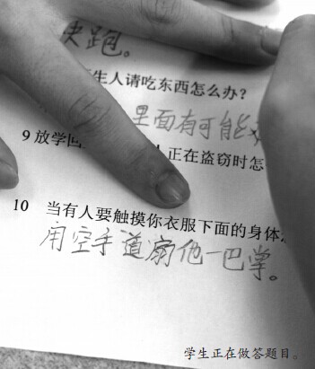 在参与问卷调查的学生中,超七成回答“不让摸”,表示要“跑、让他扑个空”、“大喊‘抓小偷’”、“咬他”等。但有20多个学生回答“不知道怎么办”,其中一个孩子说,父母没有教过她。