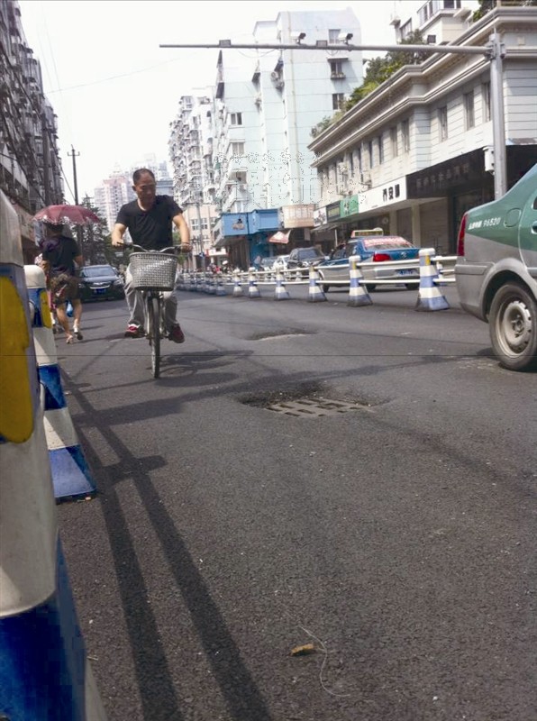 昨日上午,记者来到县前头,只见广场路交叉口至华盖山隧道的路面是新铺的柏油路,但路中间分布着一个个窨井盖坑。记者数了一下,兴文里以西的县前头路段长约210米,有10个窨井盖坑,深度为3厘米至13厘米不等。