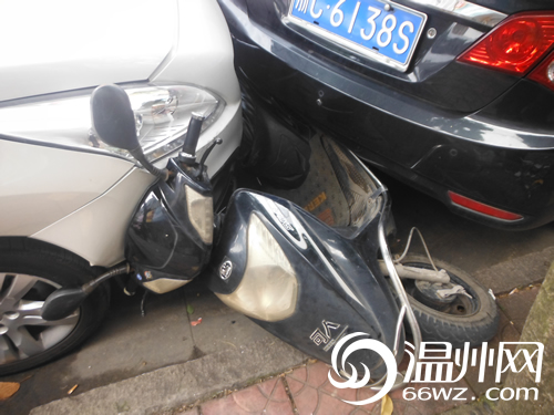 抢车位的悲剧:电动车被撞成“夹心饼干”