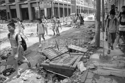 学校西边一段约百米的路面上满是沙石,两边随处可见施工沙土和排水管。中午11时45分,学校下课铃声响后,学生从校门口涌出来。家长们上前抓住孩子的手,小心翼翼行走。由于路面有坑及建筑材料,孩子得绕着走跳着走。