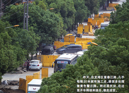 名人花园业主杨女士说,自从施工开始,这条路就经常路阻。在该小区物业上班的一工作人员说,这里路面开挖后,她上班就不准时了,一般每天在富春江路上都要堵十几二十分钟,中秋过后上班第一天,居然堵了40多分钟。